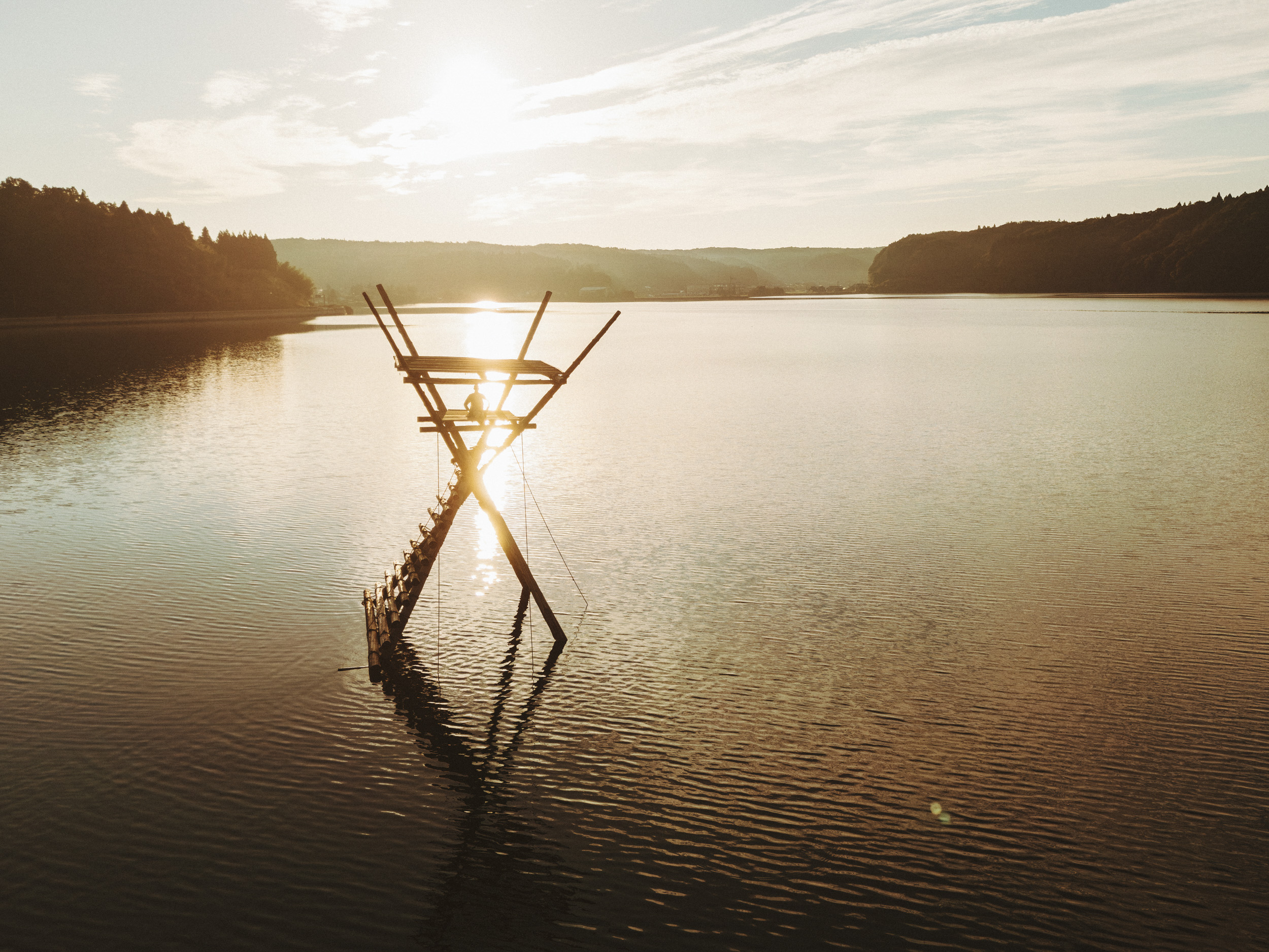 栗園を後にして車を走らせると、かつてボラ待ち網漁に使われた「ボラ待ちやぐら」が海に建っているのを発見。この漁法は江戸時代から伝わる日本最古の手法で、穴水では1996年まで実際に行われていました。丸太で組んだやぐらの上から海底に張ったふくろ網を見張り、ボラの群れが入ると一気に引き上げる仕組みです。