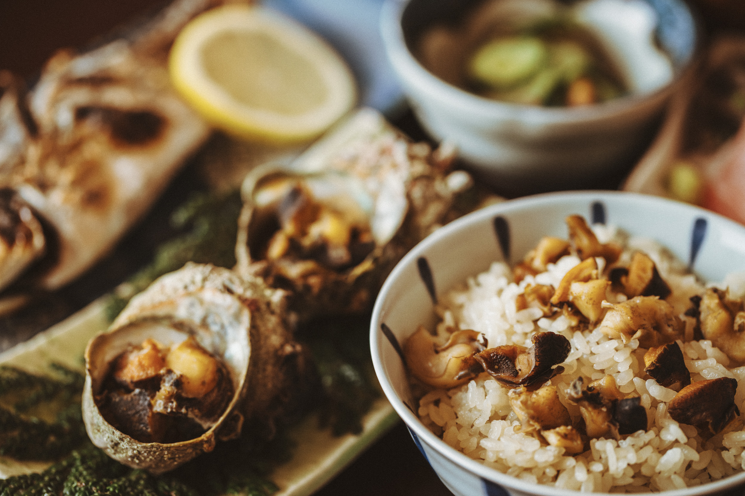 お造りをひと口いただくと、想像を超えるやわらかさと潮の香りにおどろきました。店主に伺うと、一度殻から身を取り出して小さく刻み、再び殻に盛り直すことで、このやわらかさが生まれるのだそうです。サザエとお米を一緒に炊き込んだご飯はふっくらと炊きあがり、貝の出汁が米粒のひとつひとつに染み込んでいます。