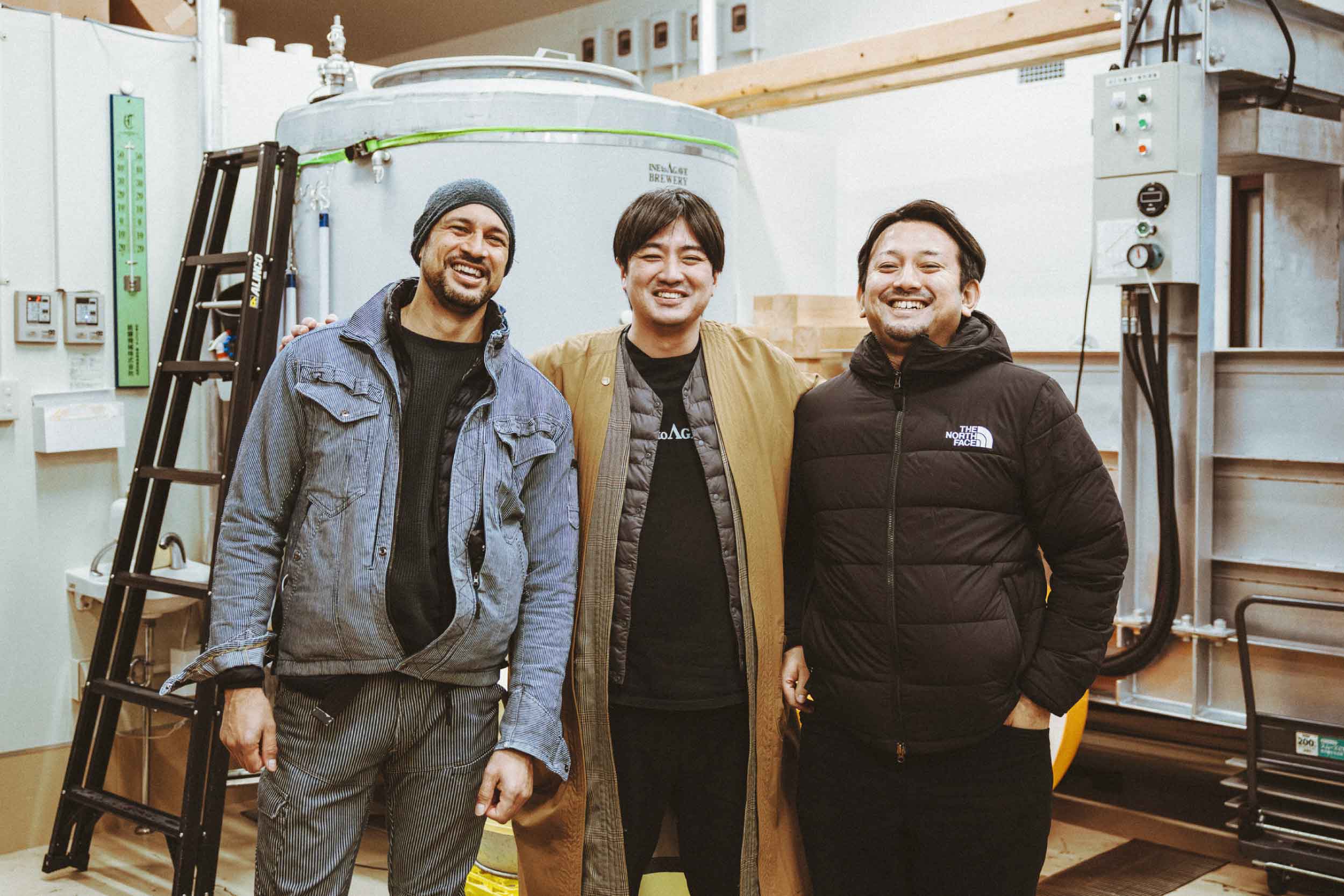 (株式会社STABLESで800degreesのマネジメントに携わる兼政公一さん(右)と、稲とアガベ代表 岡住修兵さん(中央)。旧男鹿駅を改修した稲とアガベクラフトサケ醸造所にて、蔵人であるバーブ・ジョエルさん(左)と共に)
