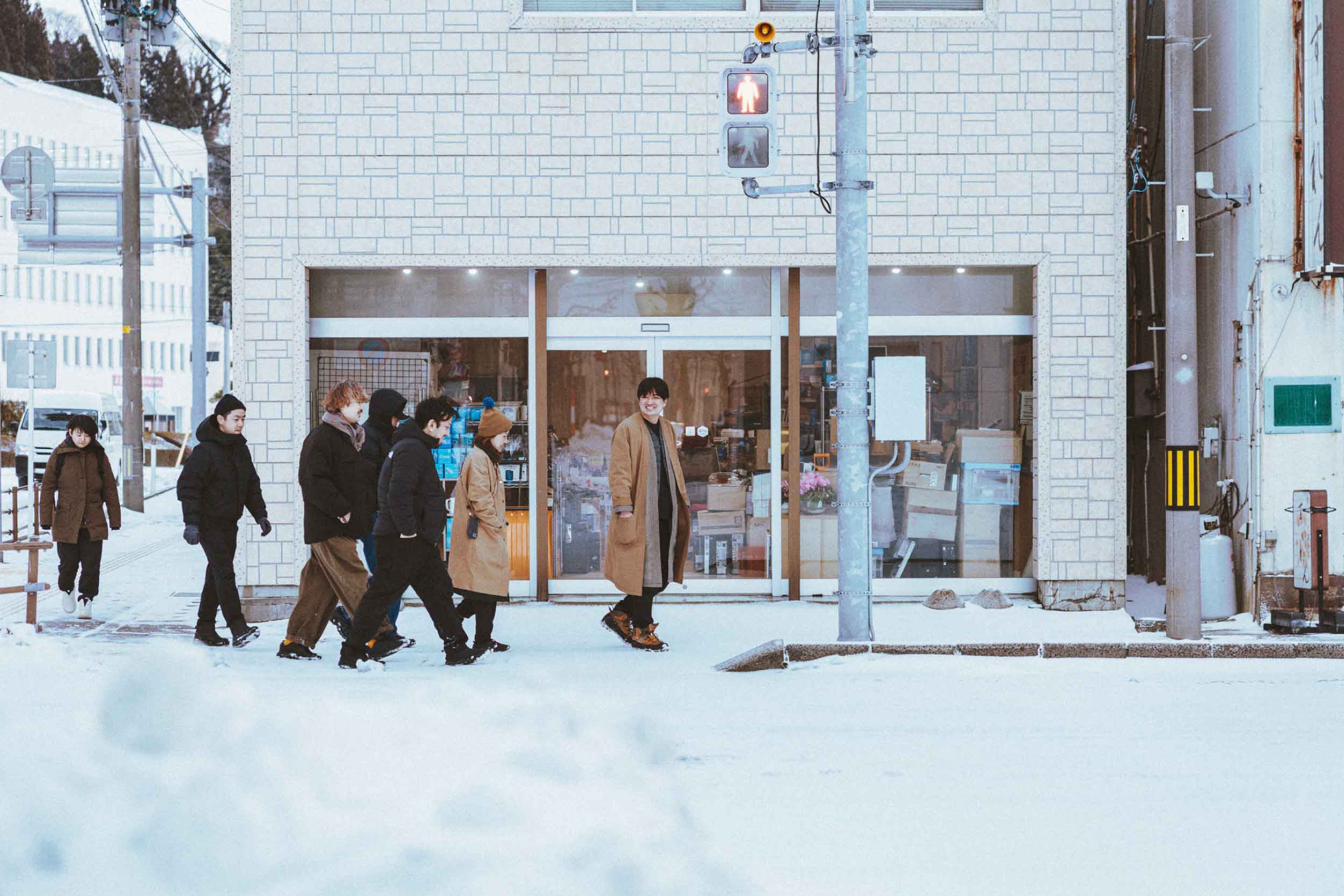 (取材時は2026年1月。岡住さんと共に男鹿の街を歩くさとタボラ取材チーム)